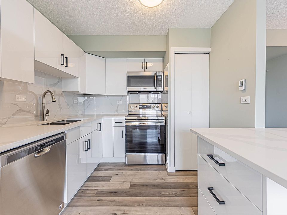 South-facing condoModern updatesMove-in readyQuartz countertopsStainless steel appliancesBeautiful tile backsplashOpen-concept living
