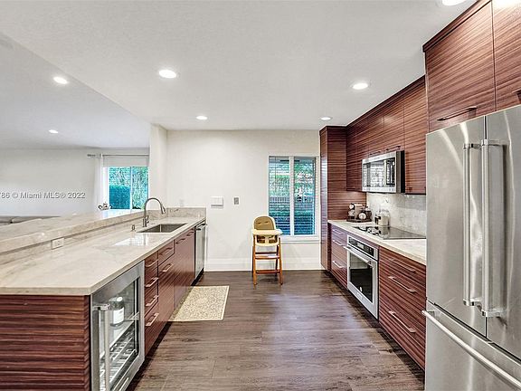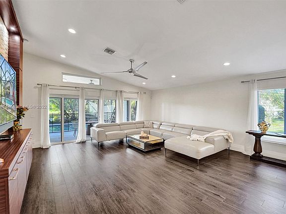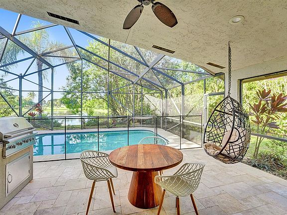 Welcome to Boca Greens Country Club, a non-mandatory golf club membership community. This adorable fully renovated lakefront home with a private screened-in salt water system pool features a custom kitchen, with all ss appliances, marble baths, high-end customized closet systems in all bedrooms, and high-impact windows all around the property. This property is situated on the longest end of the lake with magnificent sunsets. In addition to the view and upgrades, this property has a beautiful and functional side yard which is perfect for kids and pets. Basic cable TV and fiber internet are included in the low HOA fees. Gated community. The roof is 2018.
