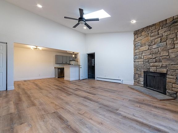 Relax in the spacious living room with vaulted ceilings, a wood-burning fireplace, an added ceiling fan, and recessed lighting; the two bedrooms are roomy and comfortable, with plenty of natural light to fill the space. The two bathrooms have also been updated with modern finishes and fixtures, making them functional and stylish.