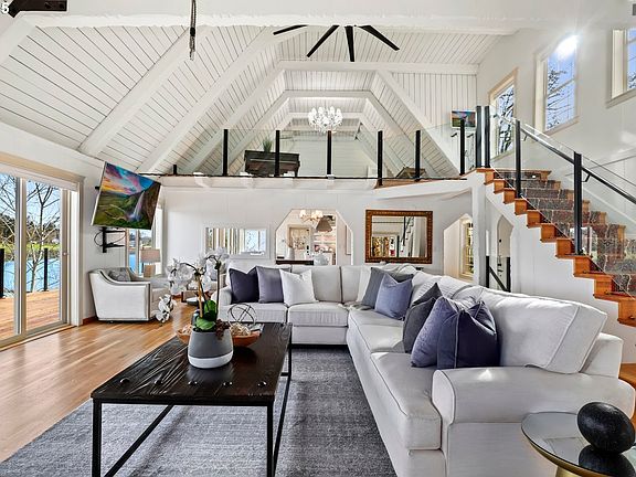 This gated Willamette Riverfront retreat offers exceptional privacy and panoramic views throughout. Inside, enjoy soaring ceilings, gleaming hardwoods, quartz countertops and a flexible lower level with potential for a fourth bedroom. The dramatic loft features a wet bar and an outdoor balcony—ideal for entertaining. Listen to the year-round waterfall as you walk down the steps that lead to a new gangway and private boat dock. Wake up to stunning sunrises and unobstructed views of the Waverley Country Club golf course and the river below. Every room offers a front-row seat to the Christmas ships, Fourth of July fireworks, sea lions, eagles, and more—visible through a dramatic wall of river-facing windows or from the many expansive decks. A large carport with stair access leads to 444 square feet of attic space with high ceilings, offering excellent expansion potential. Located in the prestigious Dunthorpe neighborhood. Plus, the seasonal Historic Willamette Shore Trolley is able pick you up at your front door, allowing easy access to downtown Lake Oswego or a scenic ride to Portland’s SW Waterfront.