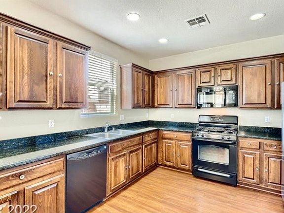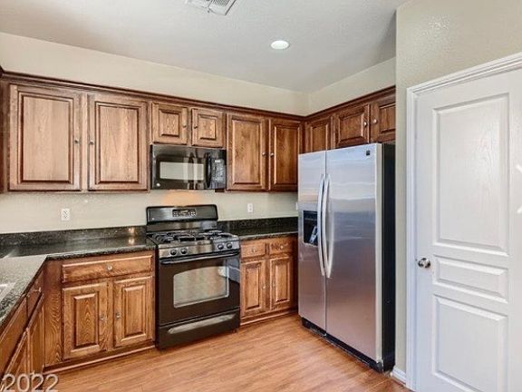 Welcome to this spacious and beautifully maintained Over 2200sq, large 3 bedrooms, 2.5 bathroom home located in the desirable Mountain Edge gated community. Wood floor of whole house. No carpet at all. Shutter windows in living room, upgraded features. Newer wood floor of 2nd floor all rooms. Kitchen granite counter, ceiling fans, convenient location for school, park, and easy access to Blue Diamond/Rainbow.