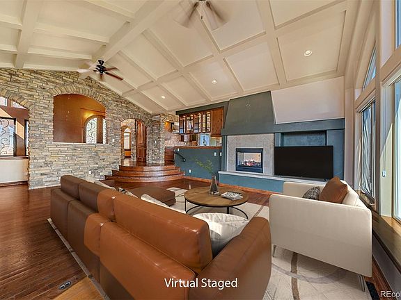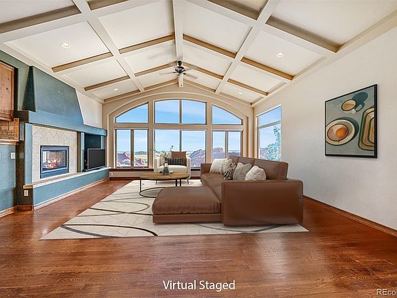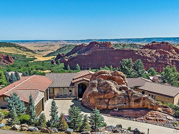 Located on one of the most beautiful view lots in Roxborough Park! Designed around a mystical rock formation in order to preserve its beauty. Unsurpassed views! The interior tastefully blends with the environment. Hardwood floors grace the main level. Huge windows & vaulted ceilings bring the majestic views inside. The great room boasts a dual sided fireplace to the deck. The kitchen has a 6-burner Wolf gas range (& griddle) & a high efficiency hood with warming lights. Slab granite countertops include the grand center island complete with a prep sink. The kitchen walks out to a large deck with a motorized awning where you’ll spend countless hours taking in the views, or stargazing on a cloudless night. The hearth room with gas fireplace is adjacent to the kitchen. A powder bath, laundry & mud room are just around the corner. There is a Butler’s pantry leading to the dining room that has vaulted ceilings & large windows looking out to Pike National Forest. The/library has a built-in desk, bookcase accenting an entire wall & an adjacent deck. There is a secondary bedroom with an ensuite full bath & a charming powder room on this level. The primary suite, located in the south wing of the main level, is comprised of a 5-piece bath ensemble, huge walk-in closet & gorgeous iron doors that lead to a courtyard patio where the mesmerizing rock formation provides ample privacy. The finished walk-out basement has a family room, gas fireplace, stone arches & a 15’x25’ game room that walks out to another huge deck! Entertain your guests in the 16’x21’ cafe with a gorgeous curved bar that includes a beverage refrigerator & a dishwasher. A powder bath & a wine closet are located here as well. There are 2 additional bedrooms with ensuite baths & an incredible unfinished area that measures 19’x47’, perfect for any additional square footage, just waiting for your imagination’s finishing touches. A beautiful red tile roof & 4-car garage place the final polish on this rare beauty!