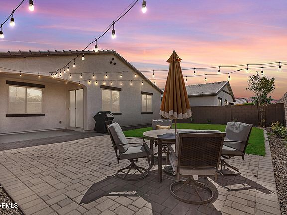 Welcome to this stunning 3 bedroom + den, 2 bathroom home in the award winning community of Eastmark! Situated on a private lot with no neighbors behind and backing to the disc golf course, this home is loaded with upgrades inside and out. Highlights include a pavered driveway, wood-look tile throughout the main living areas, quartz countertops, black hardware, a walk in pantry, and unique designer touches such as multi color upgraded tile in the den/office, custom light green paneling in a secondary bedroom, gold finishes with wallpaper, and upgraded mirrors in the primary bath. The garage offers epoxy flooring and track paneling for organization. Step outside to a beautifully finished backyard with pavers, lush grass, and string lights perfect for entertaining. Enjoy Eastmark's unmatched amenities including a resort-style pool, community center, numerous parks, and close proximity to Steadfast Farm. Don't miss this move-in ready show-stopper!