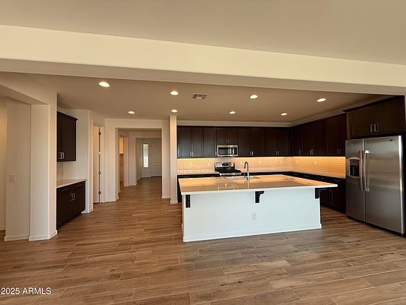 Brand NEW BUILD with community POOL, Near Loop 101 access. This newly constructed single-story home in Parkside comes with 4 bedrooms, 2.5 baths, and a 3-car tandem garage. The upgraded kitchen features quartz countertops, 42'' upper cabinets, a custom tile backsplash, and opens to a spacious great room and dining area ideal for entertaining. The primary suite includes dual vanities, a walk-in closet, and a tiled shower. Stylish tile flooring flows through the main living areas with plush carpet in the bedrooms. Enjoy a covered front porch, block fencing, and community amenities including playgrounds, tennis courts, and pickleball. Conveniently located near schools, shopping, dining, and freeway access.