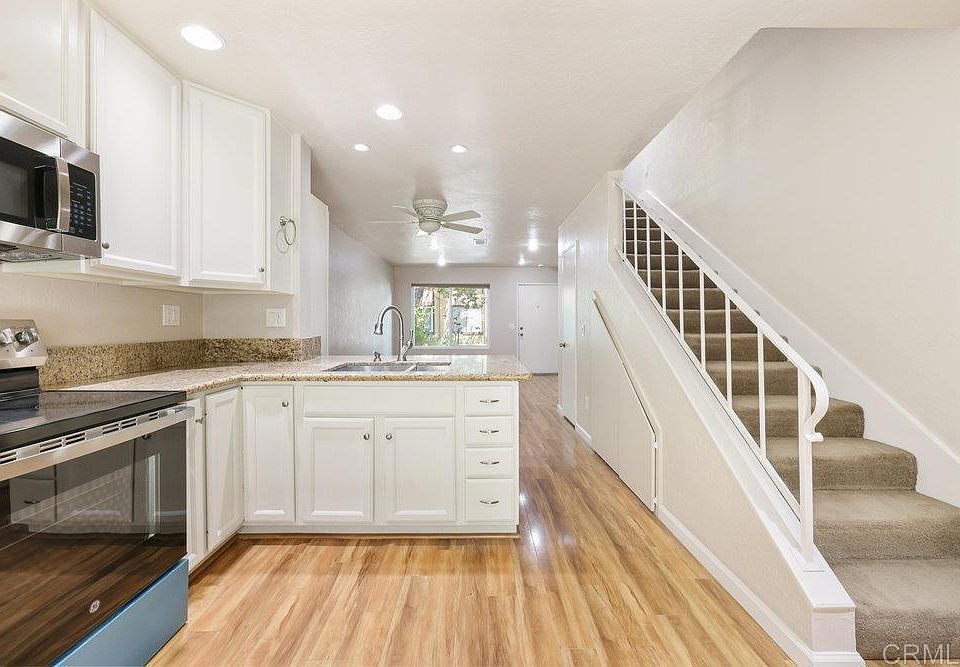 PRICE REDUCTION! Discover the charm of this beautifully maintained condo, offering a perfect blend of comfort and convenience in a well-known park-like community. Step inside to a spacious living area, perfect for entertaining friends and family. The wood laminate flooring flows seamlessly into the open kitchen. The kitchen features granite countertops, bar seating, brand-new stainless steel appliances, and plenty of cabinet space, making it ideal for family cooking at home. The large sliding glass door brings in lots of natural light and provides easy access to the outdoor space, making indoor-outdoor living a breeze. Enjoy the covered private outdoor patio, an ideal spot for relaxing and soaking up the San Diego weather and also where the private washer and dryer closet is located. This home also boasts upgraded dual-pane windows, central heat and AC, and professionally cleaned carpets. Upstairs, you’ll find two large bedrooms with ample closet space and a beautifully updated shared bathroom featuring modern fixtures, a tiled shower-tub combo, and a contemporary design. The hallway offers additional storage, ensuring clutter-free living. The park-like community features well-maintained landscaping with large mature trees and open grassy areas along the sidewalks. Plus, there is plenty of parking space for you and your guests. The unit is centrally located with easy access to local shops, dining, and major freeways.