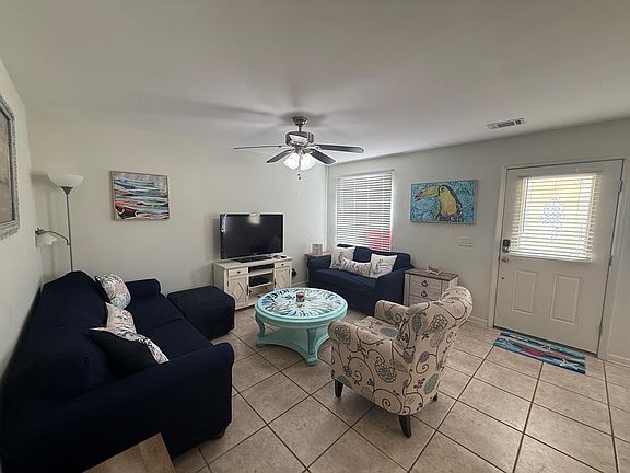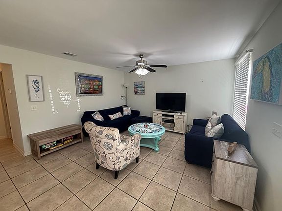 This 3-bedroom, 2-bathroom townhouse is situated within the Palms subdivision of Mexico Beach, located just half a mile from the shoreline. The community offers residents the convenience of a swimming pool. The ground floor boasts an open-plan layout featuring a master bedroom adjacent to the kitchen, a jack-and-jill bathroom, and a walk-in closet. The second floor comprises two additional bedrooms and another bathroom. Additionally, this townhome includes a potential bonus room upstairs that can serve as a fourth bedroom or office. It is fully furnished, ready for immediate occupancy, and permits short-term rentals.