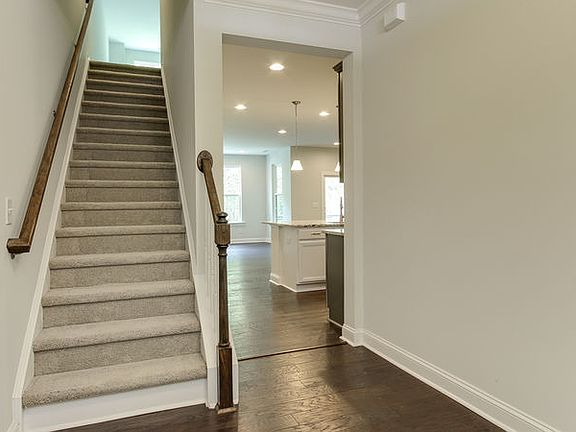 The Emerson's delightful floor plan puts the kitchen in the center of the three-bedroom, two and a half bath townhome. After you enter the foyer, then past the staircase, the kitchen opens to the Great Room and dining room. The spacious island kitchen, appointed with Whirlpool appliances and birch cabinetry, includes a pantry and drop zone, which opens to the two-car garage. Homeowners can choose a gourmet-kitchen option, which includes a separate oven and stove. From the dining room, step out onto the screened porch, which can be extended with an optional patio. A fireplace may also be added in the Great Room. Upstairs, the lavish owner's bath features a garden tub and shower. A spacious walk-in closet, is also included in the two other bedrooms. Adjacent to the owner's suite, a loft can be converted into a fourth bedroom.