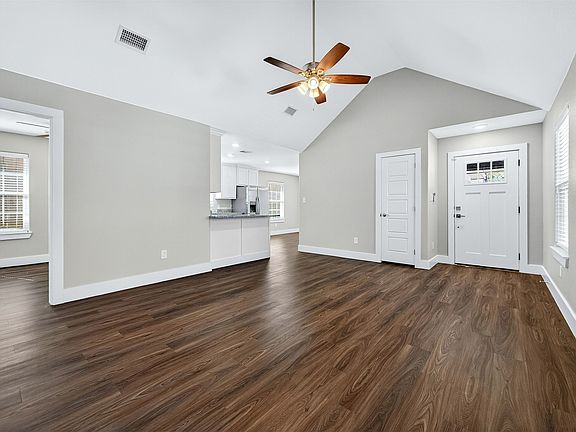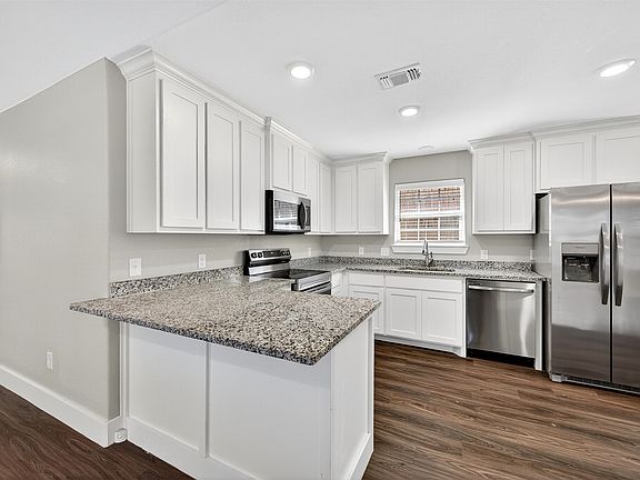 Recessed lightingStainless steel appliancesGranite countertopsWindow blindsVaulted ceilingWhite shaker cabinetsCoat closet
