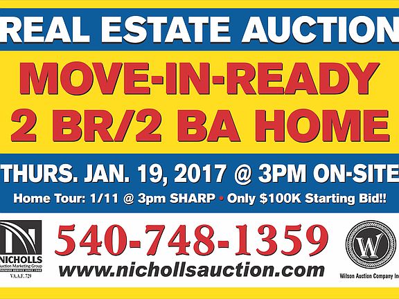 ***REAL ESTATE AUCTION*** List Price is starting bid only. Price to be determined at live public auction. Move-in-Ready 2BR/2BA Home Located in Culpeper Country Club Estates REAL ESTATE AUCTION Thursday, January 19, 2017 at 3 pm 1016 Ridgemere Lane, Culpeper, VA 22701 Price to be determined at Live Public Auction. Very clean and well maintained 2 BR/2 BA home in desirable Country Club Estates--Culpeper, VA. Only $100,000 Starting Bid. Our seller is transitioning into a more comfortable living environment, and has contracted us to market and sell this move-in-ready home at public auction. Well located in County Club Estates, this lovely home is awaiting a new owner to enjoy it for many years to come. Move-in-ready 1,828 +/- sf. 2 BR/2 BA single level home on .22 +/- acre lot in County Club Estates Eat-in kitchen w/vaulted ceiling; dining room & living room w/gas log fireplace (large open concept living area); sunroom (easily converted to a 3rd bedroom if you desire); attached 2 car garage (400 +/- sf) Hardwood flooring throughout w/tile in kitchen and bathrooms; trim & chair rail throughout Covered front porch; spacious rear deck All appliances, including washer & dryer, convey Public water/sewer; natural gas; heat pump w/gas furnace (2 years old); concrete driveway This lovely home is well located close to the Country Club of Culpeper (golf course, tennis, swimming, fitness center & more), retail, restaurants, wellness center, schools, Novant Health UVA Health System, and much more!!! Tax Map: 40Q-1-15; County Club Estates, Phase 1, Lot 15, Plat Cabinet 2/190-192; Zoned: R1; DB 2-621 Lot 15; HOA dues: $85 per year; Home built in 2000 and is vinyl sided Only $100,000 Starting Bid. ATTN REALTORS: If you are a Realtor representing a buyer, please click here and complete the broker participation form. In order to be compensated, broker forms must be completed and submitted no later than 5 pm on 1/18/17. Property Tour: Wednesday, January 11 @ 3 pm SHARP. Please contact Tony Wilson for more information or a private preview of the property (540-748-1359). For more information visit, www.nichollsauction.com Nicholls Auction Marketing Group Corporate Office: 888.357.2814 E-mail: info@nichollsauction.com On the web at: www.nichollsauction.com VAAF 729