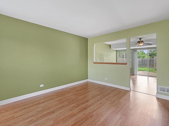 HOMETOWN SINGLE FAMILY HOME! 3 beds, 2.1 bath with 2 car attached garage. Vacant & ready for the next buyer to love. Covered front porch welcomes you to the first floor with wood laminate flooring, white trim & doors. Living room with bay window that leads to family room in the back of the home with slider to patio. Dining room in front of the home overlooking front porch & next to kitchen for easy entertaining. Kitchen has a peninsula counter top with seating, white appliances including refrigerator, gas stove/oven with microwave above, dishwasher, disposal, & a pantry closet. 1st floor laundry room off of kitchen has upper cabinets and a shelf for storage, 1/2 bath and access to the 2 car garage. 2nd level primary bedroom with bay window, ceiling fan, vaulted ceiling, walk in closet, ensuite bath with double sinks and separate tub & shower. Shared hall bath for the other 2 bedrooms. Linen closet in upper hallway & attic access. Backyard is fenced in for privacy, has green space & a paver patio. Access garage from alley behind the home. New insulated garage door & newer opener. Furnace room located in garage. NEW roof & exterior paint 2021. Hot water heater, AC, wood laminate & most appliances about 8 years old. Property comes AS IS. Hometown has many outdoor areas to enjoy such as parks, gazebo, & ponds. This home is close to shopping, entertainment, dining and schools. Elementary school is 1/2 mile, middle school 2 miles & high school 1.6 miles.