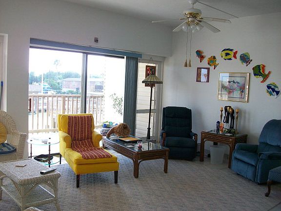 Unique furnished 2 bedroom, 2 bath waterfront condo on main channel. 2 car garage with tackle room. Large Deeded boatslip 14'x29'+/- Spacious condo and could convert to 3 bedroom. Storm shutters and large balcony with great views! 2nd floor unit with nice easy one flight of stairs. Cheerful and bright. Great Buy! Only 6 units in complex. HOA dues include: Bldg insurance, cable, water/sewer, trash, pest control & common electric & water.