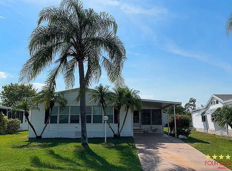 Are you ready to move right in this Spacious 2 bedroom, 2 bathroom home and make it your own. Brand New Air Conditioner 2025 and Metal Roof 2016 with transferable warranty. New concrete skirting. This Open Floor plan has a front room with lots of windows for natural lighting, built-in wall unit, China Cabinet storage galore. Dining room perfect for holiday meals. Kitchen has large island with stovetop and food pantry. The open floor plan flows into the living room space perfect for entertaining. Slider doors lead to lanai and storage shed has 2 door access. Guest bedroom has access directly to guest bathroom for convenience. Main bedroom has two closets and ensuite bathroom with garden tub and walk-in shower. This home is located within walking distance to the clubhouse and heated swimming pool perfect amount of exercise you do not need a golf cart. But there always fun to drive. Shopping and dining, is only 4 minute drive. Beaches, Sebastian Inlet 15 minute drive. Location is Perfect. Call for private showing.