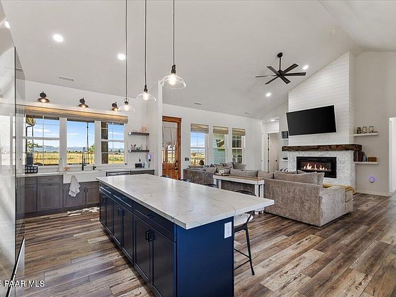 Nestled within the up-and-coming Ventura Ranch community of Prescott Valley, this glamorous new country estate sits on 2 acres, welcoming you through a gated entrance and circular paver driveway. The home's exterior makes a striking impression with rustic wood beams, a durable metal roof, stone accents, painted siding, and sleek black-framed windows that provide modern curb appeal. Rock landscaping and perimeter fencing frame the property beautifully, while both front and back porches invite you to take in wide-open sunrise and sunset views.Inside, the home's soaring ceilings and modern farmhouse touches create an inviting yet sophisticated atmosphere. The great room centers around an electric fireplace with a stone surround and shiplap accents, adding warmth and charm to the open layout.The kitchen is truly a showstopper, showcasing dual-tone cabinetry with a striking blue island, rich stained shaker-style cabinets, and abundant quartz counter space. A smooth-top electric range with double ovens, farmhouse sink, walk-in pantry, under-cabinet lighting, and elegant pendant fixtures combine to create a space that is as functional as it is stylish, perfect for both everyday living and entertaining.The split floor plan places the primary suite in its own private wing, and features a cozy reading bench in the primary bedroom. The ensuite bathroom is designed with a barn-door entry and a luxurious spa-style wet room featuring an oversized shower and soaking tub. A thoughtful touch connects the primary walk-in closet directly to the laundry room for added convenience.Three additional bedrooms each enjoy direct bathroom access, including a Jack-and-Jill design for two of the bedrooms, while a versatile flex room with double barn doors offers options for a home office, den, or fitness space. Luxury wood-look vinyl flooring flows throughout the main living areas, complemented by hexagon tile accents in three of the bathrooms.Outdoor living shines here with a covered back patio designed as an outdoor living room, overlooking a landscaped oasis with artificial turf, a fire pit, and a large fenced area that includes raised garden beds.The oversized three-car garage provides ample space for vehicles, recreational toys, or a workshop. Modern comforts complete the picture with fiber optic internet, a private water company supported by a 100-year water certificate, an 80-gallon water heater, and stylish Roman shades on every window. Propane is available with the option for a buried tank.Blending rustic charm with modern amenities, this estate offers the perfect setting for country living with every contemporary convenience.