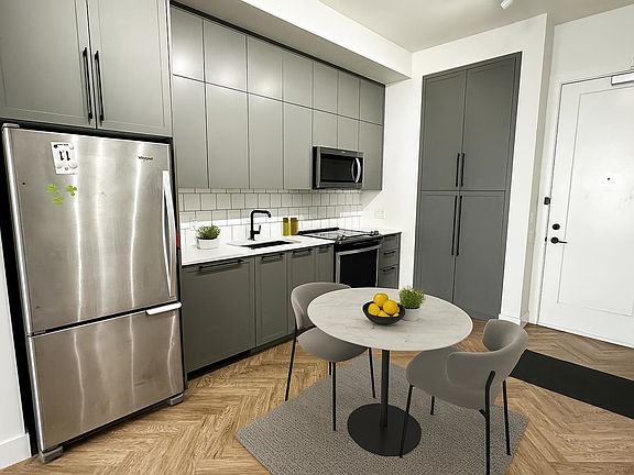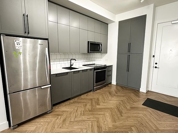 Herringbone floorsSleek kitchenGrey cabinetryStainless steel appliancesSubway tile backsplashQuartz countertopsPrivate patio