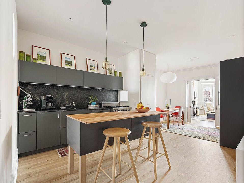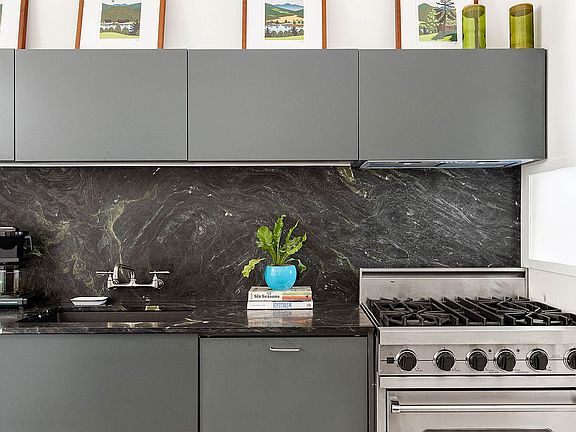 Enter this stunning home and prepare to be amazed by the 9’2” ceilings and treetop views from every window, plus Manhattan views from the living room & office. Showcasing a recently renovated kitchen by renowned architectural firm TBo Architects, the kitchen features matte green lacquer custom wood cabinetry with honed Green Fusion Marble Slab Top & Backsplash, wall-mounted faucet, chef worthy appliances such as a vented Viking Range, Bosch dishwasher and a cleverly hidden paneled Fisher Paykel fridge. Friends & family can gather around the oversized oak-topped island with tons of convenient storage & gorgeous pendant lighting or have a formal dinner in the oversized dining area that easily accommodates dinner for 10.