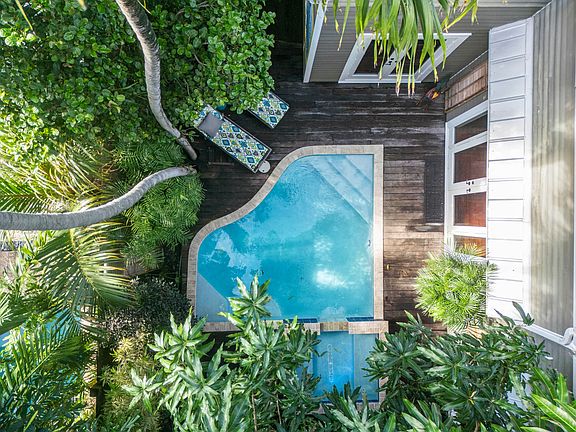 The perfect embodiment of Key West located on a quiet lane in Old Town just a stroll from Duval Street and Historic Seaport. This cozy newly renovated, 3-bedroom, 3.5-bathroom home is the ultimate blend of calm island style inside and out. From the moment you arrive, 1017 Angela Street welcomes you with bold colors and playful design. The front porch offers an idyllic spot to start or end your days. As you enter the home, you're greeted by Historic Dade County Pine lined walls and an abundance of natural light filled with personality, wood floors, and colorful finishes. The kitchen offers granite countertops and stainless steel appliances with a separate expansive dining area that opens through impact rated French doors to the backyard perfect for entertaining or enjoying the island breeze. Downstairs you will also find a primary suite with ensuite bath offering convenience and privacy.As you make your way up a custom-painted staircase, you'll find two additional ensuite bedrooms, a second primary bedroom with a luxurious spa-like bath and a cozy reading nook that overlooks the shaded canopies below, and an additional guest suite.Outside you will find a beautifully landscaped backyard with a heated pool and an upgraded pool system, spa, outdoor shower, Trex decking, and tropical foliage and fruit trees that provide shade and seclusion. Whether you're dining alfresco under the stars or lounging poolside, this outdoor space is designed for island-style entertaining and sets the tone for relaxed island living. With off-street parking and a strong track record as a top-performing monthly vacation rental, this home is ideal as a personal escape, income-generating property, or both.