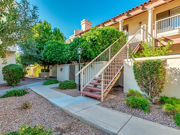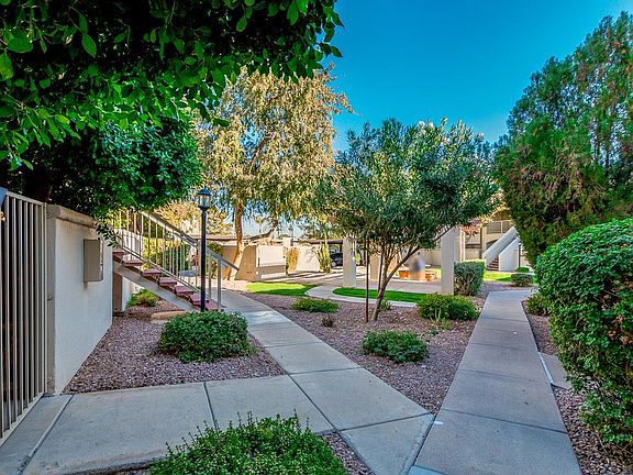 - step into the inviting and serene 14ft vaulted cathedral vaulted ceiling great room - with abundance of natural light from high windows on north wall - windows on south wall that drench a spacious living room with the Valley of the Sun's famous ray - giving you outside views from kitchen, dining room and living room. Private patio with lush greenery from Ficus trees on ground floor to enjoy with storage room. cozy brick fireplace in corner