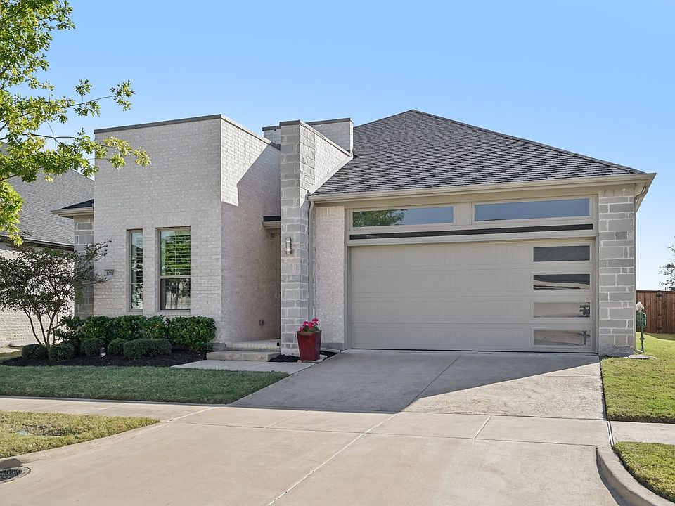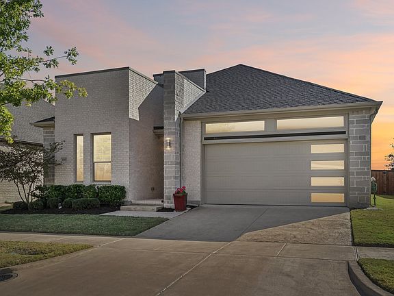 Discover modern, easy living in this beautifully maintained 2-bedroom, 2-bath, 2-car garage home—bright, open, and thoughtfully designed on one level. Just a short stroll to the amenity center, you'll enjoy pickleball courts, a sparkling pool, walking trails, and a relaxing fire-pit area right in the neighborhood. Inside, the home welcomes you with wood floors throughout and an airy open-concept layout. The stunning kitchen features stainless double ovens, a gas cooktop with vent-out, wine cooler and an oversized island that flows seamlessly into the family room, complete with a sleek modern electric fireplace—perfect for entertaining. A dedicated office or flex room offers space for work or hobbies. The guest bedroom is ideally located at the front of the home for privacy, while the primary suite sits quietly at the back with views of the yard. Enjoy a spa-like bathroom with dual vanities, a large walk-in modern shower, and a roomy closet. Step outside to your covered patio and take in the beautiful sunset views. With sliding doors and a built-in grill, it’s the perfect place to unwind or host friends. Close to shopping, dining, and major highways 121 and 75, this home blends convenience with a true resort-style lifestyle. Move-in ready, impeccably modern, and just steps from every amenity—you’ll love calling this one home.