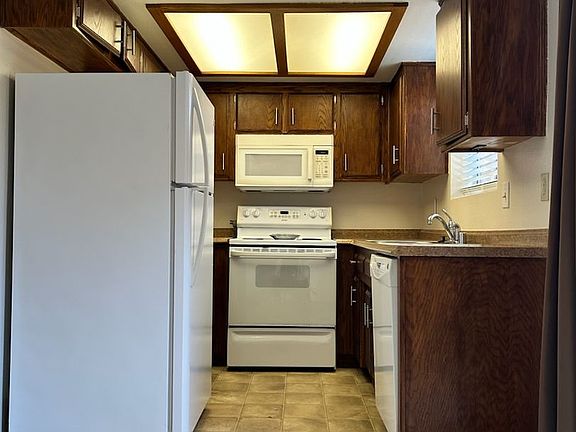 U-Shape Kitchen with white appliances, built in microwave, and Formica countertops.