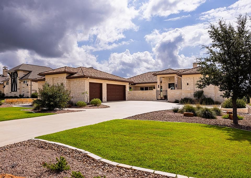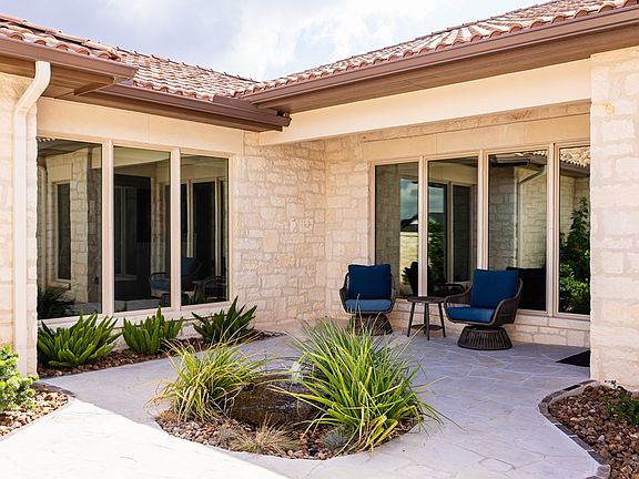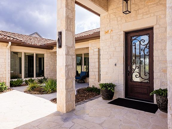 Stunning hill country home overlooking the golf course, pond and surrounding hill country with perfect SE exposure from the large covered back patio. This pristine home is light and bright and filled with walls of glass. Quality, craftsmanship & amazing attention to detail is what you will find. Charming front entry courtyard, gorgeous interior stone fireplace, vaulted ceiling with rustic beams, wood floors, window shades on remote, gourmet kitchen with commercial 6 burner gas range, large prep island and working pantry. Fabulous outdoor area with stone fireplace and built in grill is perfect for entertaining while enjoying the SE breeze & spectacular views. Guest suites with private baths. Primary suite is a spa-like retreat with his and her vanities, free standing tub, large shower and his and her closets filled with built ins. This home is move in ready and a must see! Comanche Trace is a master-planned community with many amenities including private Guadalupe River park, 3 1/2 miles of crushed granite walking trails, stocked fishing lake, community garden & more. Golf & Social Memberships are also available. Come for the views and stay for the lifestyle!