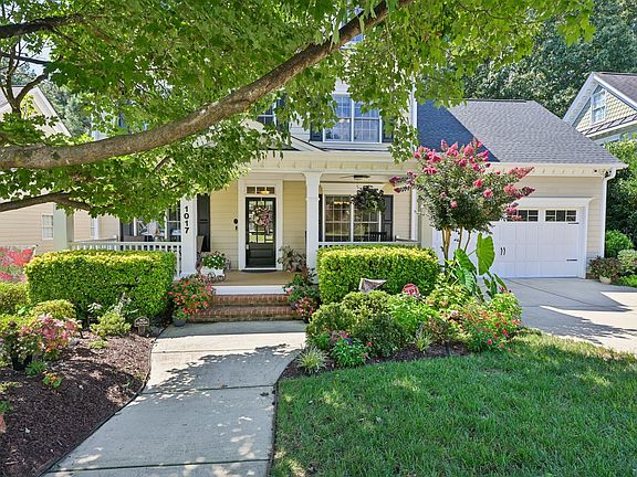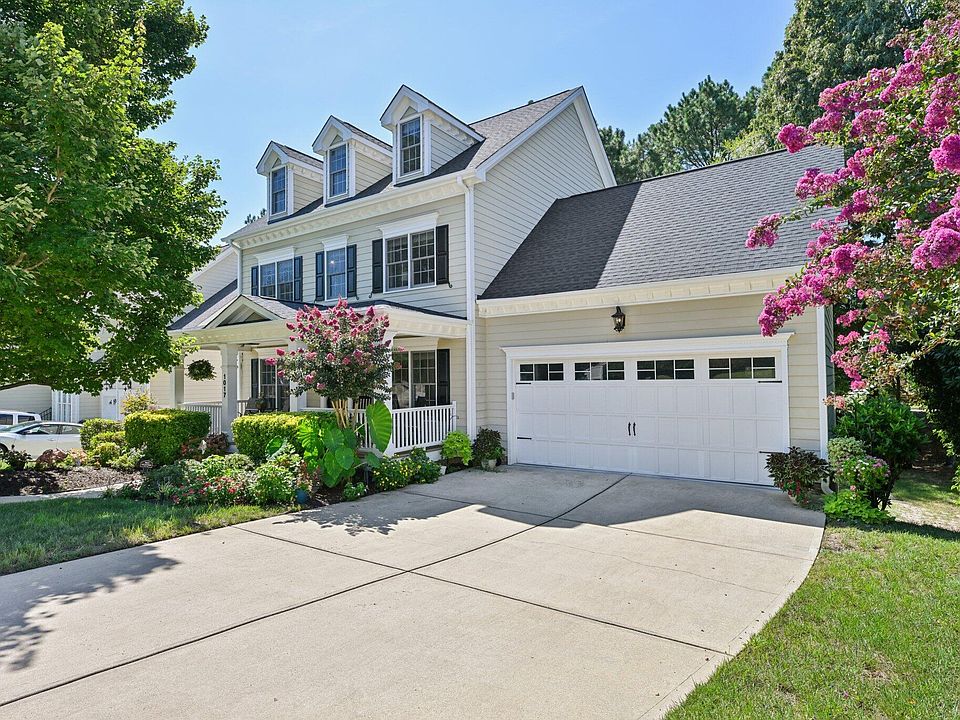 This custom-built 5-bedroom, 4.5-bathroom home offers the perfect blend of comfort, function, and style across three thoughtfully designed levels! From the moment you arrive, the oversized front porch sets the tone—an inviting space where mornings are spent with coffee and weekends with a slower pace. Inside, the spacious living room welcomes you with soaring ceilings, a warm fireplace, and built-ins that add both character and practicality. Just off the main living space, the formal dining room is perfectly suited for everything from holiday gatherings to casual dinners. The kitchen is designed as the heart of the home, featuring granite countertops, stainless steel appliances, a tile backsplash, and a breakfast bar that naturally draws people together. A first-floor office offers flexibility for remote work or quiet retreat. Upstairs, four bedrooms await, including an oversized primary suite with ample space to create your own private haven. The third level expands the possibilities further with a fifth bedroom—ideal for guests, a playroom, or a creative space. Outdoor living is equally inviting, with a private rear deck and two patios offering multiple places to relax, entertain, or enjoy the natural backdrop. A built-in sprinkler system keeps the yard low-maintenance. Recent updates add even more value and peace of mind, including a fully encapsulated crawl space (2022), a new roof (2023), and an upstairs HVAC system (2023). Tucked in a convenient location, this home provides quick access to both I-540 and I-40/440, making commuting and exploring the Triangle a breeze.
