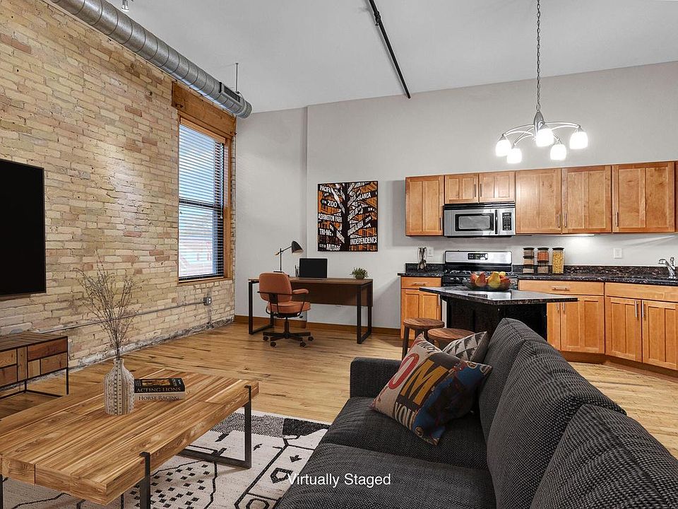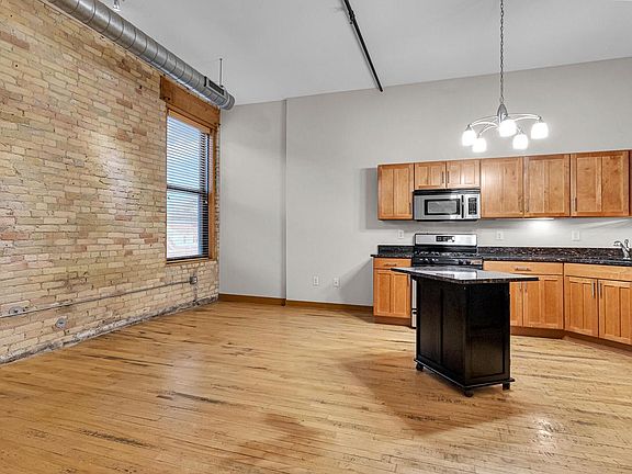 Movable islandSoaring ceilingsSouth-facing windowsExposed cream city brickIndustrial-style ductworkOriginal hardwood floorsStainless steel appliances
