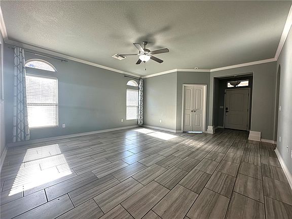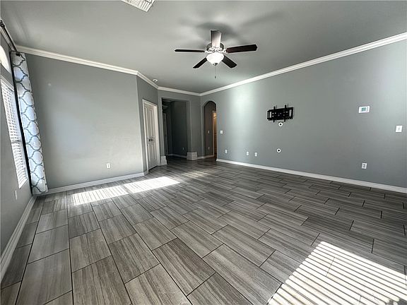 This spacious home features an inviting foyer that opens into a large, airy living room. High ceilings and crown molding add a touch of elegance. The dining area flows seamlessly into the kitchen, which boasts custom wood cabinets, granite countertops, a breakfast bar for two, and a large island. Upgraded stainless steel appliances, including a 30" double oven and glass cooktop, make cooking a pleasure, while a sizable pantry offers plenty of storage. The master bedroom includes plush carpeting, a stylish high tray ceiling, and a ceiling fan. The master bath features a double vanity and a large tub/shower combo. Two additional carpeted bedrooms with ceiling fans provide cozy living spaces, while a tiled fourth bedroom with a large window works perfectly as an office. The garage is wired for an extra refrigerator or freezer. Outside, the open back patio and the spacious back and side yards offer plenty of room, with an irrigation sprinkler system simplifying maintenance.