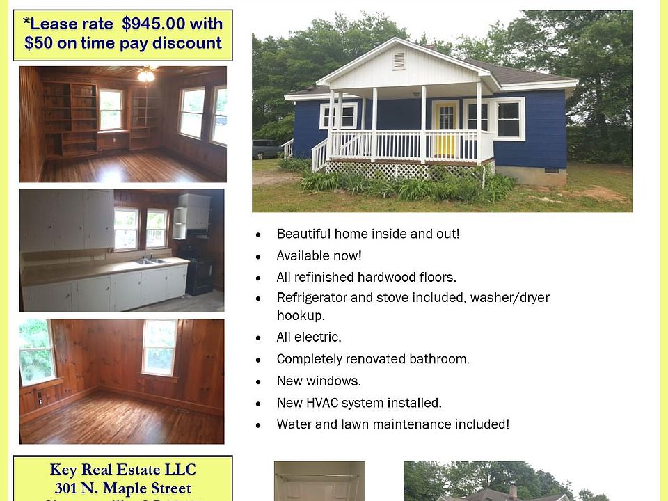 AVAILABLE NOW! 2 bedroom 1 bath house. $895.00 per month (lease rate is $945.00 with $50 discount if you pay on or before the first of each month). $945.00 security deposit required. Water and lawn maintenance are included in the lease rate. All electric, new central HVAC, washer/dryer hookup. All refinished hardwood floors and completely renovated bathroom. No pets. Non smoking home. Appliances include refrigerator and stove. If you want to submit an application, $45 application fee for first applicant and $15 for each additional applicant. All tenants over the age of 18 are required to be on the application. Applicants under the age of 21 require a co-signor. Application fee covers nationwide background check and credit check. To verify employment, please be prepared to submit 2 months work of check stubs from employer. To move in you will need security deposit of $945 and first month's rent. Check out the key to view the property for a deposit of $60.00, returned when the key is returned at our office: 301 N. Maple Street, Simpsonville, SC 29681 M-F 9:00-4:00 PM. 1 year lease. Owner pays water and lawn maintenance.