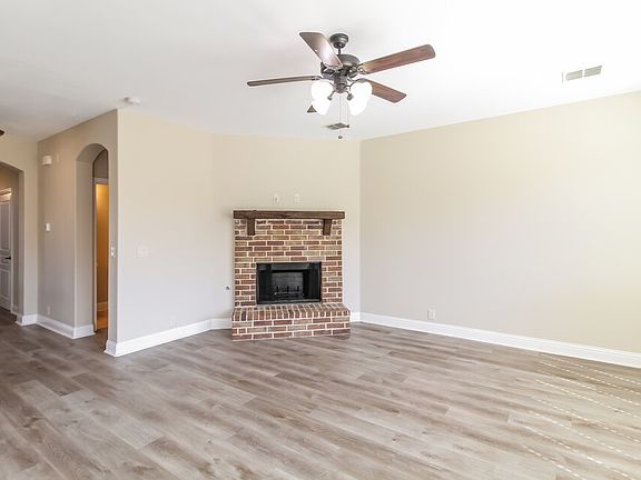Red brick fireplaceAttached garageFenced yardBuilt-in microwaveLuxurious glass-walled showerSleek black countertopsLighted ceiling fan