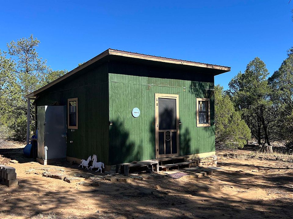 25 Acre Secluded Lot Near Public Land – Owner Financing Available Situated in the northeast corner of Catron County within Wild Horse Ranch, this lot offers privacy among Ponderosa and Piñon Pines. Improvements include a 16' x 16' bunkhouse featuring a metal roof, camping toilet, pressure tank, and on-demand hot water heater. The property is equipped with five solar panels, six 225-amp batteries, and an inverter providing 450 watts of power, as well as a backup generator. On-grid electricity is accessible via power lines along the property boundary. Additional amenities consist of two storage sheds, a gazebo, and a fire pit. Wild Horse Ranch provides private, subdivision-owned wells for residents to haul water. This remote and exclusive location is only 60 miles from Grants, NM, where shopping, supplies, and medical facilities are available.