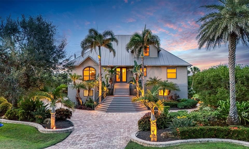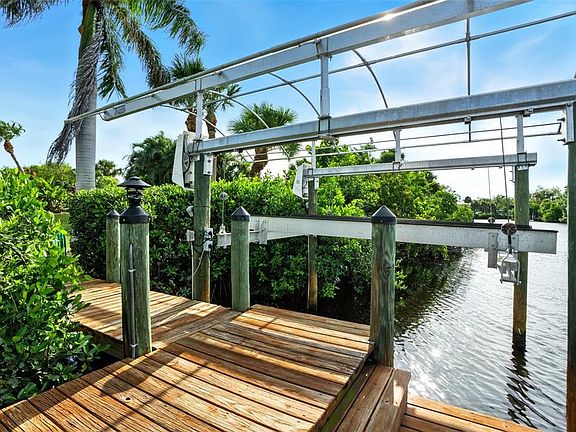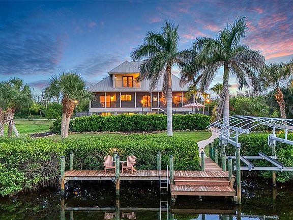 Welcome to Placida Paradise, a waterfront estate in the gated community of Coral Cove. Built in 2007 and enhanced with new landscaping, stone accents and custom details throughout, this Key West–inspired retreat offers 2,298 sq ft under air (5,553 total) and an adjacent vacant lot for privacy or future possibilities. Set along the Amberjack Cove waterway with direct access to Coral Creek, the Intracoastal and the Gulf of Mexico, this property is a boater’s dream. Two private docks and a 10,000 lb boat lift provide opportunities for fishing, paddleboarding and cruising from your backyard. The home is designed for entertaining and everyday comfort. The 25x55 elevated pool and spa is framed by lush landscaping and a spacious deck with water views. The screened lanai stretches the length of the home and features a full outdoor kitchen with built-in grill and bar. The second floor serves as the main living hub with soaring ceilings, a great room anchored by a gas fireplace and a wall of windows. The kitchen offers granite countertops, wood cabinetry, stainless appliances, a wine refrigerator, custom horizontal wine storage and a pass-through window to the lanai. Two guest bedrooms, a full bath and a large laundry room complete this level. A private elevator connects the ground-level garage, storage and bonus space to the main floor. The third level is dedicated to the owner’s suite with a private balcony, walk-in closet with built-ins, skylight, custom furniture that conveys and an en suite bath with dual vanities, linen closet and an oversized shower with dual showerheads. Additional features include impact windows and doors, a metal roof, new irrigation, landscape lighting and an electric fence for pets. The oversized three-car garage with workshop and storage space offers room for vehicles, kayaks, fishing gear or a home gym. Located minutes from Boca Grande and Palm Island, with aerial views reaching the Boca Grande Causeway and Gulf of America, this home is an opportunity to enjoy privacy, elegance and true coastal living.