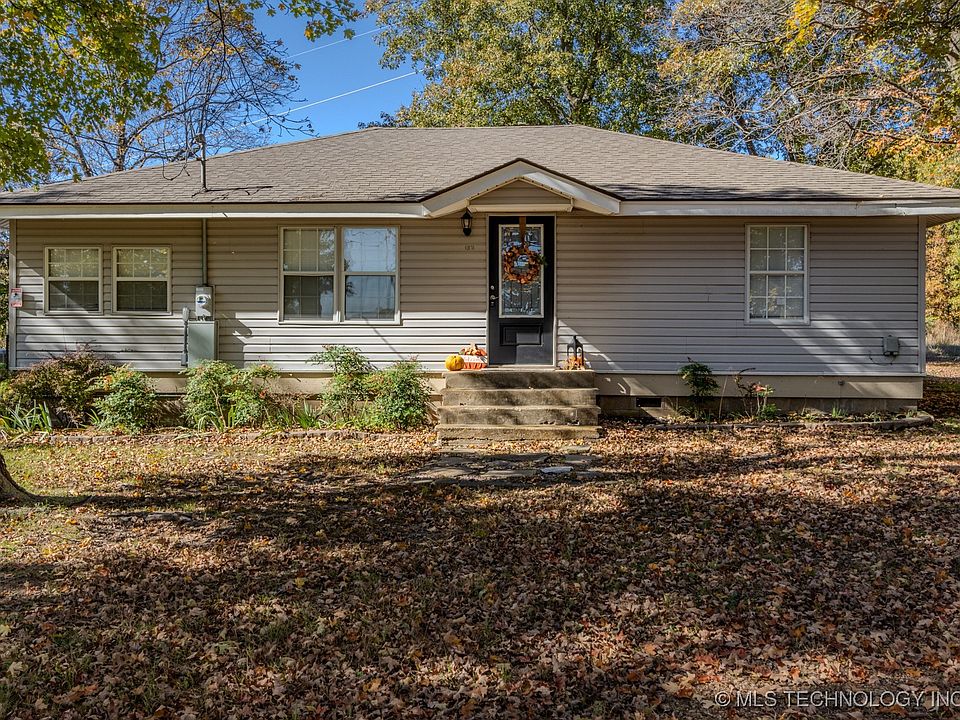 Lovely remodeled home, approx. 3 miles from the corner of Hwy 82 and Alt Hwy 412. (The intersection is between Eastside Church of Christ and the Pirate Arena.) Trees surround this home, and there is a front covered porch with an ornate front door with glass insets. It makes a nice first impression. The home is move-in-ready. This is not the ordinary cookie-cutter ranch home. You will appreciate the design and rounded archway in the living room and hallway. There is a large rectangular cutout between the living room and kitchen. You never feel divided from your family and friends while in the kitchen. It has a nice layout that flows easily throughout. There are 4 exterior doors and wide hallways that give the home a spaciousness you will appreciate. There is a bedroom off the living room, another one near the main bathroom, and the master bedroom is down the hall. The utility room is oversized and has shelving and extra storage space. The kitchen is an eat-in kitchen with extra room or the living room is large enough for a dining table. The kitchen countertops, cabinets are new, new faucets, windows, and flooring. New appliances. Remodeled bathrooms. There is a new heat and air unit, new. This location is just minutes from all the businesses and activities Locust Grove has to offer, plus easy access to the turnpike and Lake Hudson.