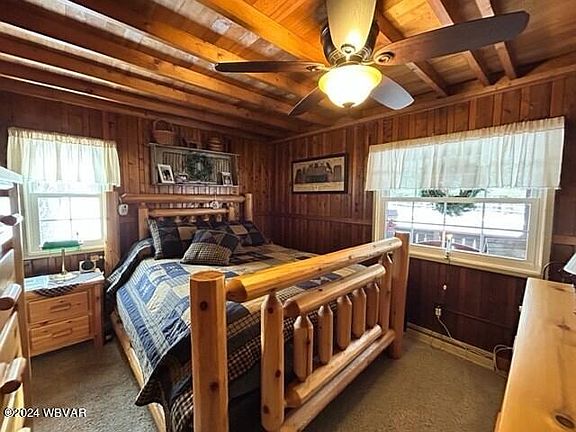 Beautiful log home in the heart of Northern PA Sate land near the Sinnemahoning Dam. This home boasts 2 bedrooms, 1 bath and a loft with 4 single guest beds. The pellet stove insert in the beautiful stone fireplace keeps the cabin warm and cozy as you watch the deer and elk graze in the back yard. There is plenty of storage in the full, walk out basement and in the 2 sheds in addition to the 2 car detached garage. The owner added a storage shed underneath the whole length of the house in the back. There is a lovely stone fireplace and ring in the back yard that is landscaped with beautiful flowers in the Spring and Summer months. You can hunt the 2.1 million acres of State Forest and fish the pristine waters of the Sinnemahoning or kayak on the lake. Mostly you will want to enjoy the view