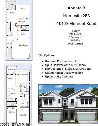 With detailed exterior trim, soothing colors and grand stonework, the Acosta offers both curb appeal and character. Step through the 8-foot entry door into a magnificent foyer with soaring ceilings and a grand staircase that set the tone for this thoughtfully designed home. An open flex area is located off the foyer that makes a great space for an office or formal dining room. The kitchen features maple latte kinsdale cabinetry brushed nickel hardware, quartz countertops, stainless steel vent hood, and a natural gas cook top. Prepare game-day treats in the gourmet kitchen as guests gather around the expansive island, perfectly positioned for TV viewing. Slide open the glass doors to extend your entertaining space into the fenced backyard overlooking a lush preserve. Upstairs, a peaceful retreat offers the perfect space to relax with a good book. Step outside to the spacious balcony perched among the trees overlooking your fully fenced-in yard that is completely maintenance-free. The luxurious Owner's Retreat provides unmatched privacy and a tranquil view of the preserve. Golf cart up to the Recharge Amenity Center and enjoy the resort-style pool, fitness center, playground and dog park. All this, in Jacksonville's most central location just minutes from the St. Johns Town Center, Mayo Clinic, and beautiful sandy beaches. Living in the Villas @ Kettering in eTown means a low-maintenance and convenient lifestyle - schedule your visit today!