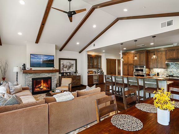 Step inside to an inviting great room with soaring vaulted ceilings, oversized windows, and a cozy stone fireplace the perfect backdrop for relaxed mornings, apres-ski evenings, or family movie nights on the large Smart TV. The open-concept floor plan connects the living, kitchen, and dining spaces, making it ideal for gathering and entertaining. Clean-lined furnishings, warm wood accents, and curated decor strike the perfect balance between modern design and alpine charm.