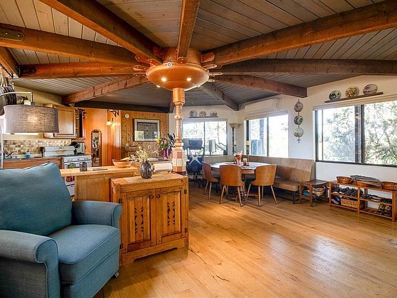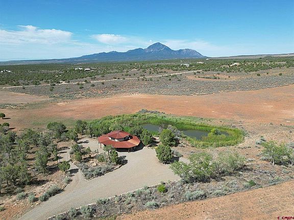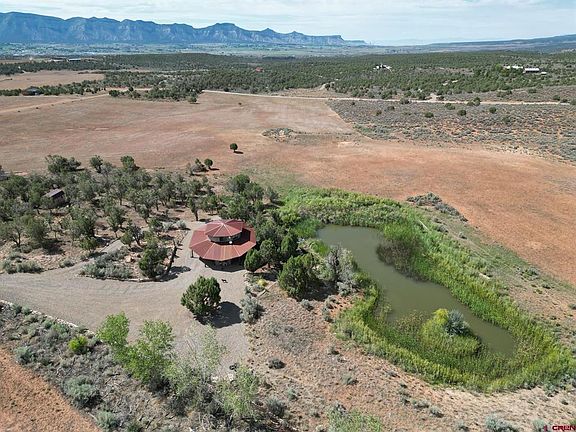 Experience unparalleled tranquility on this expansive 37-acre property in Indian Camp Ranch Subdivision. This custom-built one-bedroom home offers a serene retreat with breathtaking views, a private pond, and a versatile detached studio perfect for work or relaxation. Step inside to discover a blend of modern design and timeless craftsmanship. The open-concept living area features light hardwood floors. Unique touches like the handcrafted leather-bound door and cleverly concealed washer and dryer add character and functionality. The master suite upstairs provides stunning views of Mesa Verde, La Plata Mountains, and Sleeping Ute Mountain. Outside, a gravel patio surrounds the home, offering ample space for parking, outdoor dining, and enjoying the sunsets. The property also benefits from leased irrigation water from the neighbor, ensuring the pond stays full all summer. This is your chance to own a truly unique sanctuary, combining comfort and nature in perfect harmony.