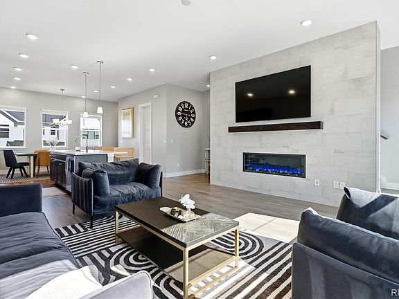 Natural light floods the open-concept main level, showcasing clean contemporary design, designer finishes, and a spacious, comfortable flow. The living room centers around a sleek modern fireplace, adding warmth and sophistication, while the adjoining dining area creates the perfect setting for hosting friends and family.