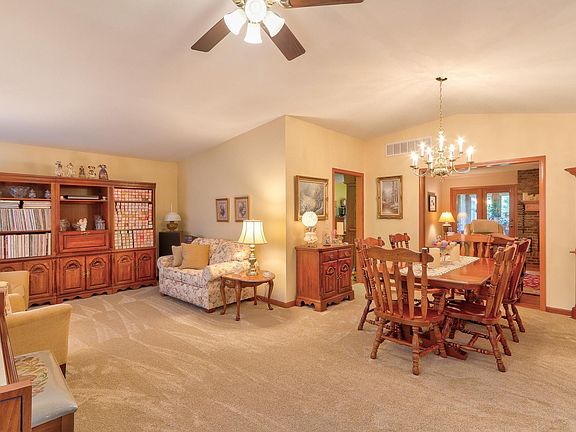 Welcome to this beautifully maintained 3 bedroom, 2.5 bath ranch that offers multiple comfortable living spaces, an abundance of storage, and a backyard retreat. The living room boasts a cozy brick fireplace and flows into a sun-drenched four-seasons room with vaulted hardwood ceilings, and the dining room doubles as a formal sitting room. The bright eat-in kitchen includes stainless steel appliances, stone countertops, tiled backsplash, a breakfast bar, and a bay window, just steps from a large laundry room with extra storage. The spacious primary suite features dual closets and an updated ensuite bath, while two additional bedrooms share the second full bath, plus a convenient half bath for guests. The beautifully landscaped, fenced backyard is home to cherry and pear trees, blueberry bushes, and two garages—attached and detached, each fitting 2.5 cars. With built-ins, custom cabinets, new windows, new carpet and paint, an alarm system, RV hookups, and wildlife views, this home provides easy living in a peaceful setting.
