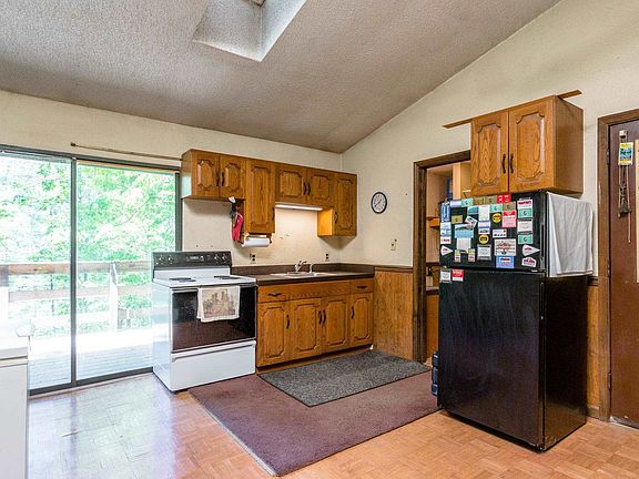 Private, wooded retreat. The house has great outdoor spaces for grilling in the flattened gravel area with retaining wall, or relaxing on the front deck or screened porch. Open floor plan for kitchen, dining, and living area. Wood stove provides perfect heat source in the winter. The shed is stick built and in great condition for storage. This would make an excellent hunting lodge.