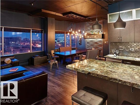 Live the good life in this stunning luxury loft in the heart of Downtown Edmonton. This expansive 8th floor unit blends modern design with timeless character, offering soaring ceilings, huge west-facing windows, and an open living area that flows seamlessly to the stylish kitchen with granite countertops, stainless steel appliances, and abundant counterspace—perfect for entertaining. The large primary suite features a custom built closet area and a spa-inspired ensuite with walk-in shower and soaker tub. A second bedroom, 4-piece main bath, generous storage room, and in-suite laundry add convenience. Secure titled underground parking and pet-friendly living (with board approval) complete the package. Steps to Rogers Place, the Ice District, Alex Decoteau Park, 104 Street Farmers Market, shops, cafés, and LRT, this remarkable home offers the ultimate downtown lifestyle with easy access to Grant MacEwan, NAIT, the Royal Alex and U of A.