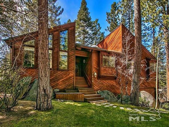 This "Tahoe Style" home features vaulted open wood beam ceilings in the living room along with a cozy river rock fireplace sitting area, and access to a huge backyard deck. Other features include a breakfast nook off the kitchen, a formal dining room with vaulted ceilings and another room with built-in bar. The master bedroom suite also features tall, vaulted ceilings with skylight, along with access to the back yard deck. There is a family room downstairs with full bath, a large utility room, and access