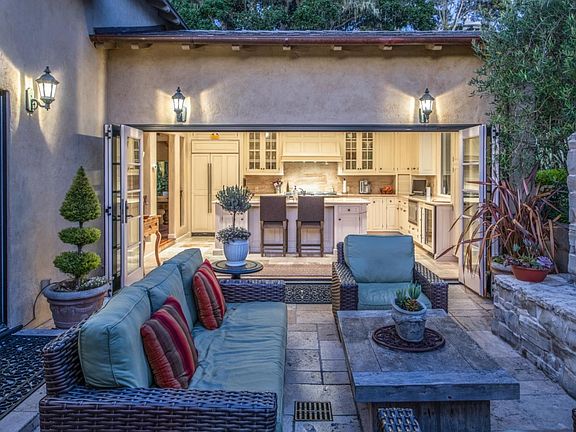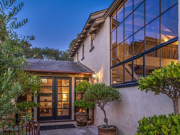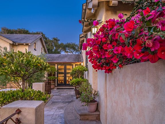 This exquisite Mediterranean home in Pebble Beach epitomizes the seamless blend of indoor and outdoor living. Step inside to discover elegant interiors featuring rich hardwood floors, intricate wrought iron fixtures, custom solid knotty alder doors, and wooden ceiling beams that exude a cozy rustic charm. Natural light floods the living spaces, offering picturesque views of fountains and peaceful patios. The expansive gourmet kitchen is a chef's delight featuring new Thermador appliances including a 48" range, double oven, and dishwasher. It's surrounded by garden windows and walls that open up to an inviting outdoor courtyard with a fire pit and BBQ island. The lavish master bedroom suite on the ground floor provides a haven of privacy and refined luxury. With three bedrooms and three and a half baths in the main house and a charming guest house featuring a bedroom and bath, this residence caters to comfort and sophistication. Outside, landscaped pathways lead to tranquil gardens, all just a minute away by golf cart from the prestigious Monterey Peninsula Country Club.