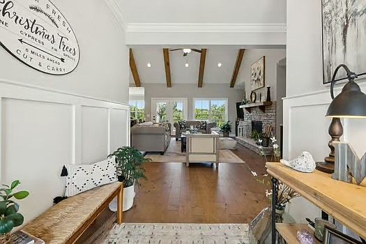 Enjoy quartz countertops, a spacious eat-in kitchen with island, two pantries, and stainless appliances. Tile backsplash. Wood beams in family room. Hardwood floors throughout the main living area, stone fireplace in the lower level family room, plus an office/study and bonus room downstairs.