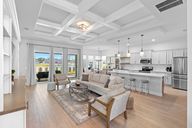 - Ceiling Fan(s), Coffered Ceiling(s), Crown Molding, Eating Space In Kitchen, High Ceilings, Kitchen/Family Room Combo, Open Floorplan, Primary Bedroom Main Floor, Solid Surface Counters, Solid Wood Cabinets, Split Bedroom, Stone Counters, Thermostat, Walk-In Closet(s)