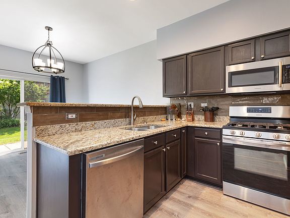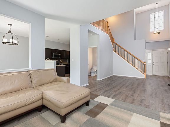 Move right into this gorgeous townhome! Enter into the 2 story foyer and your open plan main living area awaits, all with new flooring! The kitchen features granite counters, a beautiful new backsplash and stainless steel appliances. The dining room opens to the patio for easy grilling access. Upstairs you have three bedrooms, including a spacious vaulted master bedroom with a walk-in closet. The master bath was fully updated with new shower, flooring, vanity and more! And the hall bath was updated with a new shower tile surround. You'll find two more spacious bedrooms and the second-floor laundry room just steps away. The 2 car garage with a desirable semi-private driveway and direct street access is another plus. All this in a Pool Community - the clubhouse, Sports Core, is right down the street and includes a pool with zero depth entry, a water slide, kiddie pool, tennis and basketball courts and clubhouse available for party rental. The Route 59 Metra Train Station and I-88 are just minutes away and the park and elementary school are within walking distance. All this in award winning Indian Prairie School District 204! Come see this lovely home before its gone! Furnace (2023) AC (2023) Refrigerator (2021) Kitchen Faucet (2021) Backsplash (2021) Master Bathroom Update (2021) Hall Bathroom Update (2021)