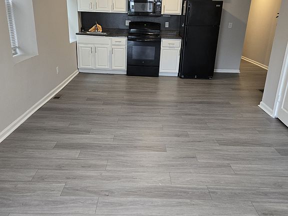 The kitchen is thoughtfully designed with black appliances that contrast beautifully with crisp white cabinets and sleek silver fixtures, offering both style and functionality. Whether you're prepping weeknight dinners or hosting friends, this kitchen supports it all with ease.