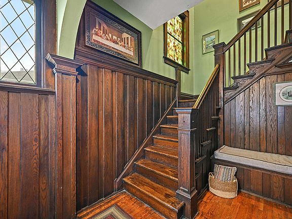 Beautifully preserved woodworkInterior transom windowsExpansive seven-bedroom historic homeSecond-floor kitchen and laundryStriking stained-glass window