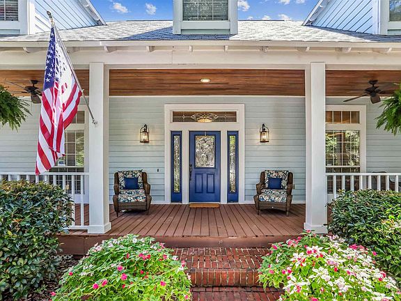 One-of-a kind custom coastal home at the head of a 1000-foot trail leading to the intercoastal waterway and a private white sand seashore. Nature abounds! You may never have this chance again–this home is so rare to be situated in and around forestland yet be so close to the water, plus it's in a private, gated community, Heron’s Forest, with a beautiful pool plus tennis, pickleball and basketball courts & numerous trails. High & dry with over 3300 square feet of custom living space, this southern charmer has expansive wraparound porches with cypress ceilings and floors, fern waterers and a screened porch. Spacious and well-planned, it has 4 (or 5) bedrooms and 3.5 baths, a huge great room and a gourmet-sized kitchen w/ large island & large pantry. Now used as an office and guest room, this bonus space could be used as a bedroom (has a closet), a formal dining room, or bonus room of any kind. The main-floor primary suite has spacious his & hers cedar-lined closets, Jacuzzi tub, separate glass shower & dual vanities. Upstairs are three spacious bedrooms, one with an en suite bath. The other bath has dual vanities. This well-maintained home has high ceilings and is filled with natural light featuring long plank hardwood floors. Accents include transoms, trey ceiling, sky lights, dormers, stained glass and thick baseboards. A sturdy cypress-ceiling breezeway leads to the oversized two-car garage (with attic) which includes a 250 square foot workshop/workout space/storage room or golf cart garage. One of the largest lots in HF, on a cul-de-sac, rare live oaks complete the canopy overhead. Irrigation on well. Privacy fenced, leave it to nature or create your dream oasis. Watch the sunrises & sunsets beam through the trees.This truly one-of-a-kind property will have you living your best life in a coastal paradise! (Sidewalks that run for miles outside of the neighborhood, close to NAS, 10-minute drive to Perdido Key, 5 to Big Lagoon State Park, 20 to Downtown Pensacola.)