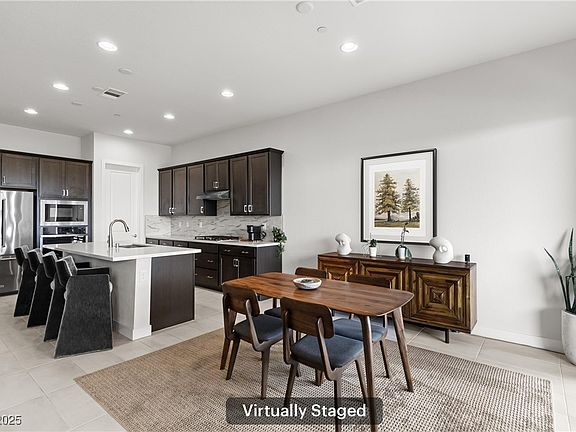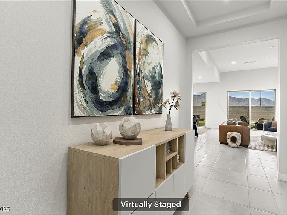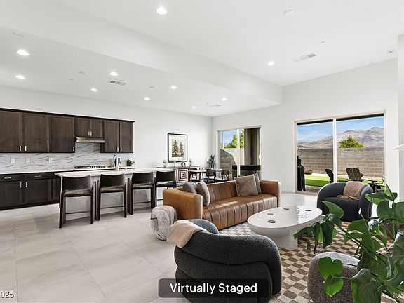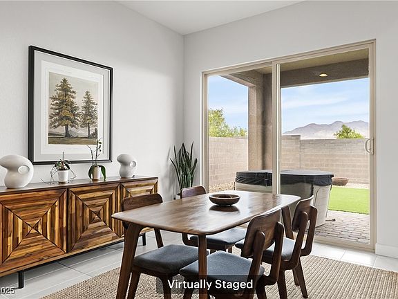 Discover modern luxury in this single-story home inside the gated Estrella at Sunstone community. A dramatic hallway opens to stunning mountain views and a spacious great room with high ceilings and dual sliders for seamless indoor-outdoor living. The gourmet kitchen shines with a large quartz island, sleek backsplash, stainless appliances over sized 4 seat island, single bowl sink and walk-in pantry. The primary suite offers serene views, an oversized walk-in shower, and a massive closet. Bedrooms 2 and 3 are generously sized with a stylish full bath with gray tile surround. Spacious laundry room with shelving and storage cabinet. Washer and dryer stay. Enjoy a private spa, oversized covered patio, Paver side yards and low-maintenance yard. 24 ft extended ( length) garage includes overhead storage, EV compatible, Ring door bell and a tankless water heater. Close to shopping, schools, outdoor adventures, and easy freeway access—this modern home has it all. Move-in ready luxury!
