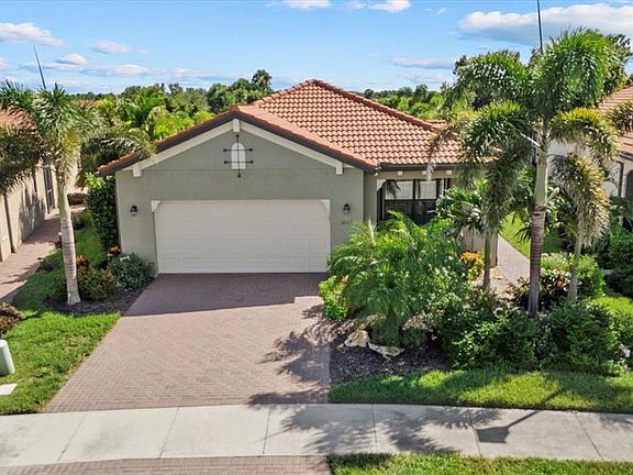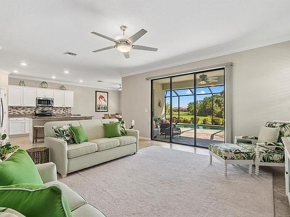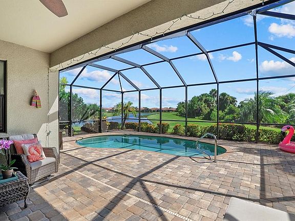 HEATED SALTWATER POOL! WATER VIEWS! HURRICANE PROTECTION! PRIVATE LANAI! Welcome to your own private slice of paradise in the guard gated community of Sarasota National. This meticulously maintained 2 bedroom, 2 bathroom home with a private office/den and 2 car garage was built in 2019 and is situated on a premium lot. This property offers WATER VIEWS in the front and in the back, with no neighbors directly behind, with an expansive green space for an unmatched sense of privacy. From the moment you arrive, you’ll notice the lush landscaping, peaceful setting from the front porch, and welcoming curb appeal. Step inside to a bright, open-concept floor plan featuring ceramic tile floors, crown molding, plantation shutters, and granite countertops throughout. The spacious great room blends seamlessly with the kitchen and dining area, making it perfect for both everyday living and entertaining. The entertainer’s kitchen is equipped with stainless steel appliances, a large center island with room for barstool seating, a corner walk-in pantry, granite countertops, and plentiful cabinetry complete with pull-out shelving. The adjacent dining area is ideally positioned for meals overlooking the pool and lake, while the living room opens through sliding glass doors to your lanai for the perfect indoor-outdoor Florida lifestyle. The spacious primary bedroom offers a custom designed walk-in closet with an en-suite bath featuring dual sinks with granite counters, a spacious walk-in shower, a separate water closet, and a linen closet for extra storage. Guests will enjoy their own private wing with a generously sized bedroom, full bath with tub/shower combo, granite vanity, and convenient hallway linen closet. A large interior laundry room provides abundant cabinetry, granite counter utility sink — making laundry day a breeze. Outside, the screened-in lanai is a showstopper, offering both a covered seating area and sunny pool deck, finished in elegant pavers. Enjoy the evening sunsets with the southwesterly facing lanai! The heated saltwater pool is perfect for year-round enjoyment which features a durable Pebbletec finish. The motorized Storm Smart hurricane protection screens allow you to control airflow and privacy, while the surrounding landscaping creates a lush and tranquil backdrop loaded with privacy. You’ll love sitting outside and soaking up the sweeping lake views and the open green space beyond — the setting feels like a private resort. Additional highlights include accordion hurricane shutters, a retractable screen on the front door and outdoor solar lighting along the front and the back of the home. Living in Sarasota National means enjoying resort-style amenities including a clubhouse with indoor dining, resort style pool with outdoor tiki bar dining, social activities, whirlpool tub, playground, fitness center, tennis, pickleball, bocce ball, and more! Sarasota National is an Audubon International Silver Signature member home to a variety of wildlife. All this is just minutes from Downtown Venice, Wellen Park, CoolToday park, shopping, dining, Gulf beaches, and easy access to I-75. This home checks every box — privacy, sweeping water views, a heated saltwater pool, and open layout, all within one of Venice’s premier gated communities. Please copy and paste the following link into your browser to view the luxury video of this home: https://player.vimeo.com/video/1109996551?badge=0&autopause=0&player_id=0&app_id=58479